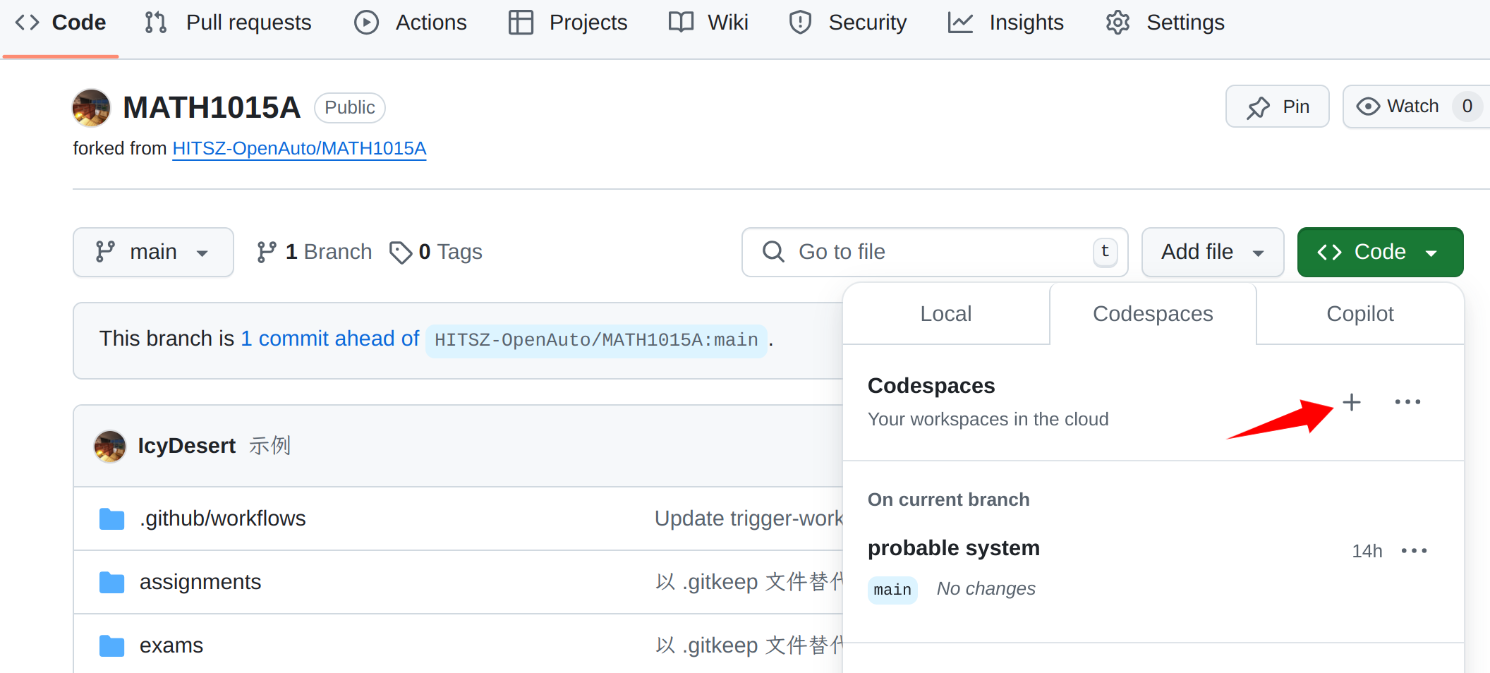 然后在你的仓库里如图新建 Codespaces,等待页面跳转、加载。可能要等一段时间。