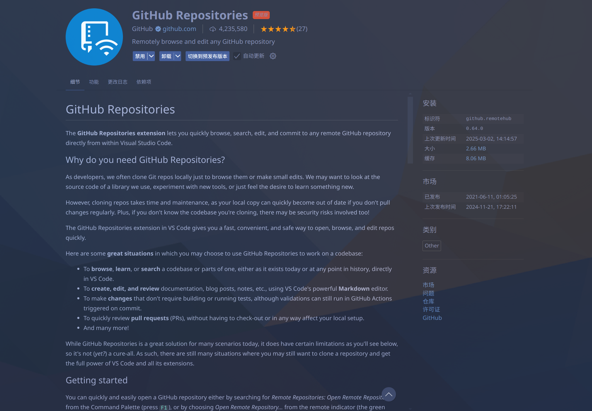 下载并安装 GitHub Repositories 插件。当然,你也可以在 VS Code 的插件市场搜索。